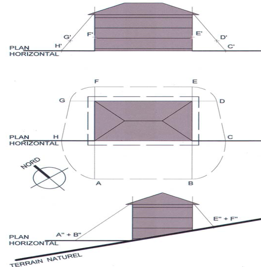 2Pour tracer le gabarit sud, on projette le terrain sur un plan horizontal dont le niveau est situé à la cote moyenne du pied de la façade sud sur terrain naturel.