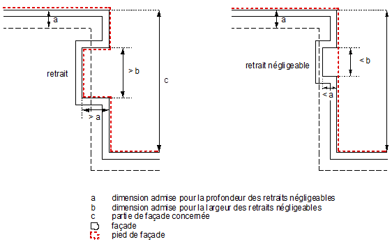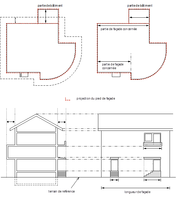 Surface enveloppant le bâtiment, définie par les lignes verticales comprises entre les angles extérieurs du corps de bâtiment. Les plans des façades sont situés au-dessus du terrain de référence. Les saillies et retraits négligeables ne sont pas pris en considération.