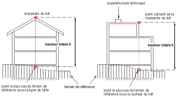 Plus grande hauteur entre le point le plus haut de la charpente du toit, mesurée à l’aplomb du terrain de référence.