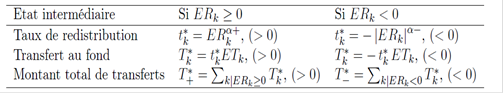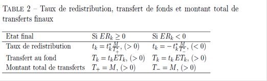 La Table 2 définit le taux de redistribution, le transfert de fonds et le montant total de transferts finaux.