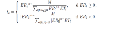 La seconde étape consiste à appliquer un facteur correctif au taux de redistribution intermédiaire (t*k) afin que les montants totaux à transférer soient égaux au montant à redistribuer (M). Le facteur correctif est le ratio du montant à redistribuer (M) sur le montant total de transferts intermédiaires (T*+ ou T*- selon que ERk≥ 0 ou ERk ≤ 0).