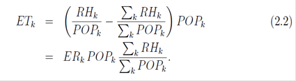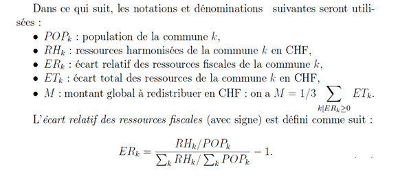 Ce dernier est compris entre -1 et 1. Il permet de comparer la richesse des communes en se basant sur le revenu fiscal par habitant (RHk/ POPk). La moyenne pondérée des écarts relatifs sur toutes les communes vaut 0. Plus une commune a un revenu fiscal par habitant qui s’éloigne du revenu fiscal par habitant moyen des communes du canton, plus celle-ci a un écart relatif des ressources s’éloignant de 0. Par exemple, un écart relatif négatif signifie un revenu fiscal par habitant plus bas que le revenu fiscal par habitant moyen. L’écart total des ressources fiscales (avec signe) est défini comme suit: